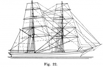 Brigg. Detta fartygs master voro båda fullriggade, fig. 22. Fockmasten saknade vanligen gaffelsegel, men på stormasten fördes ett sådant, benämnt 10briggsegel. Riggningssättet var förr mycket vanligt företrädesvis för medelstora fartyg. Skonertbriggen, ett mellanting mellan skonert och brigg, var riggad på samma sätt som toppsegelskonerten med undantag av att den även på stormasten i stället för gaffeltoppsegel förde råtoppsegel.