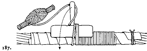 Klädkila (Serving mallef) [Kleidkeule] och på senare tider blifvit förbättradt till den modell, som vidstående figur visar. Förbättringen består i rullen vid ändan af skaftet, på hvilken klädselgarnet uppvindas, hvarefter man kan undvara den vid den gamla modellen behöfliga handtlangaren, som tager rund nystanet A på nästa figur. Ett mindre slag af klädkila är klädspånen (serving board) [Kleidspan]. B å fig. framställer en sådan, som användes vid klädsel af smäckert tågvirke. Själva klädningen å trossar kallas (serving) [Bekleidung], Att kläda lastrummet för att skydda detta eller lasten (to dunnage) [unterschlagen}. Se garnera. Att kläda fartygsbotten (to sheathe) [verhäuteri]. Se bottenklädsel och koppra.