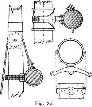 Rår. En underrå — fockrå, storrå etc. — hänger i en hangare och hålles intill masten av en rack, fig. 33, bestående av rackbygel, svivelbult och rackgaffel. Hangaren eller råborgen, vanligen av kätting, är schaklad till rundborgen på rån och i en bygel på mastens förkant. De undre märs- och bramrårna uppbäras i regel av en i esselhuvudet fästad arm, fig. 34. Rår, som skola kunna hissas och firas, övre märs-, bram- och röjelrår, äro försedda med ringformiga rackar, som omsluta stången, fig. 35. Rårna äro på nockarna försedda med stålband, i vilka byglar finnas för fastgörandet av toppläntor, brassar och perter samt skivgatt för närmast över varande segels skot. Längs hela rån löper en smal järnstång, jäckstaget, i vilket seglet bändes fast.