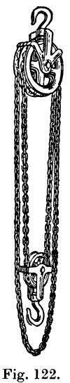 En differentialtal ja synes i fig. 122. Kraftvinsten = 2R : (R — r), i vilken formel R betecknar radien till den större och r radien till den mindre skivan i det fasta blocket.